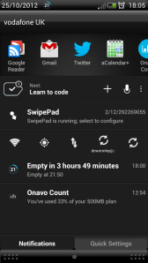 Finally, Onavo Count displays a notification to let me know how much of my data allowance for the month I’ve managed to blow through so far. Ice Cream Sandwich has built-in data usage monitoring, but I find Onavo to be a bit more powerful so I kept it after upgrading from Gingerbread (2.3.4) to Ice Cream Sandwich (4.0.3).