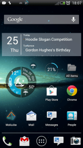 Below the search bar is Simple Calendar Widget again, albeit with some different customisations (you can tap the right-hand-side of the widget to access its settings). Underneath that, on the left, is a widget from 1Weather, a very nice weather app. I have it set to display the the ‘feels like’ temperature and some other information in the status bar/notification panel, but I hadn’t set it when I took the screenshots, so that’s why it’s missing (whoops). As for the widget itself, it displays the current temperature, high temperature, low temperature, chance of precipitation, date and location. You see that little umbrella icon in the top right of the widget? That means that it’s wet outside (the icon flips upside down when you can get away without an umbrella). The icons in the middle show the weather type (it’s dark and cloudy). Not bad for a 2×2 widget, eh?