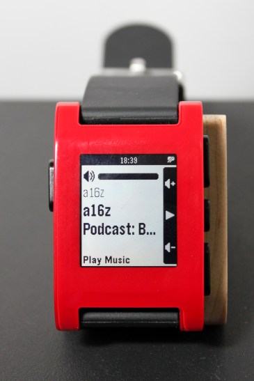 My Pebble running Music Boss. You can even multi-press the middle button to choose which media app to launch/control.